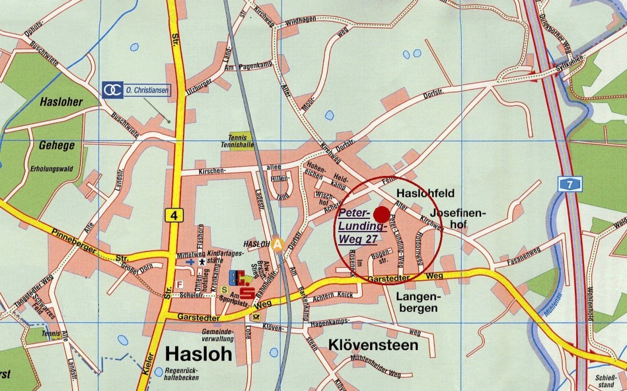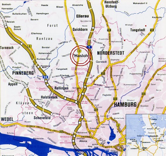 | aus Richtung Süden: | A7 Richtung Hamburg fahren, durch den Elbtunnel hindurch, weiter auf der A7 bis Ausfahrt Hamburg Schnelsen Nord. An der Abfahrt rechts abbiegen Richtung Fuhlsbüttel und Norderstedt. An der nächsten grossen Gabelung (ca. 2 km) links halten Richtung Norderstedt. Dieser Strasse folgen , durch den Wald, an der Flughafen Startbahn (rechte Seite) vorbei bis zur nächsten Ampelkreuzung (ca. 4km). An der Ampel links abbiegen und der Strasse folgen (ca. 3km, OBI Baumarkt rechts, BP Tankstelle links , Volvo Händler rechts). An der 3-ten Ampel links abbiegen nach Hasloh (Garstedter Weg). Auf dieser Strasse bleiben (wieder über die Autobahn) bis Ortsschild Hasloh. Dann ist die 3-te Strasse auf der rechten Seite der Peter Lunding Weg. |